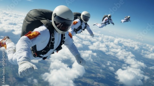 Formation skydiving team in perfect alignment, blue background with white clouds,