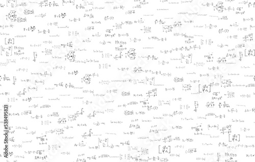 Formulas of astrophysics, quantum mechanics, radio circuits. Scientific, educational background on white. Hand drawn.