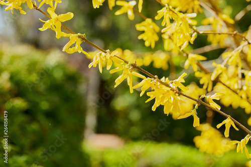 Forsythien - gelbe Frühlingsblüten unscharfer grüner Hintergrund