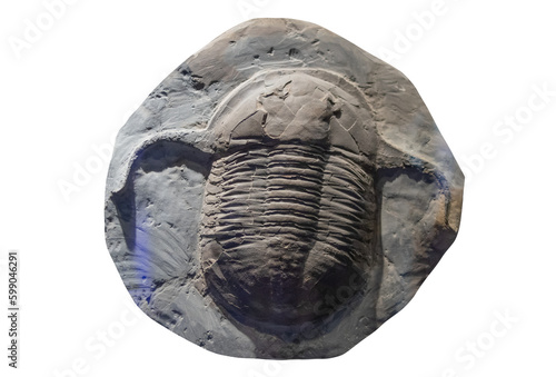 Fósil de trilobites en piedra, aislado sobre blanco. Fósiles del Jurásico. Concepto de arqueología y paleontología.