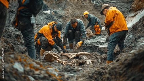 Fossil excavation site: Archaeologists uncovering dinosaur bones buried under layers of earth and rocks