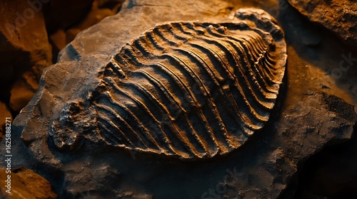 Fossil Resting on Rock Dark Brown Dramatic Lighting