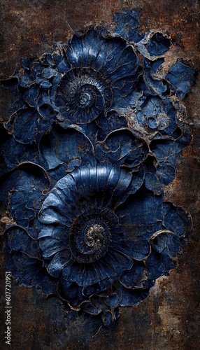 Fossilized ammonite sea shell spirals embedded into dark cobalt blue slate rock. Prehistoric layered and ridged stone texture with detailed surface patterns - generative ai