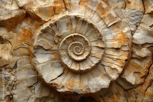 Fossilized ammonite shell showcases intricate spiral patterns on rocky surface in natural exhibit