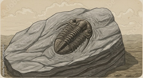 Fossilized Trilobite Embedded in Rock, Paleontological Illustration, Earth History