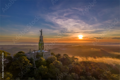 foto con dron de un amanecer con la estatua de san salvador en la isla de majorca con la niebla en las montañas de fondo