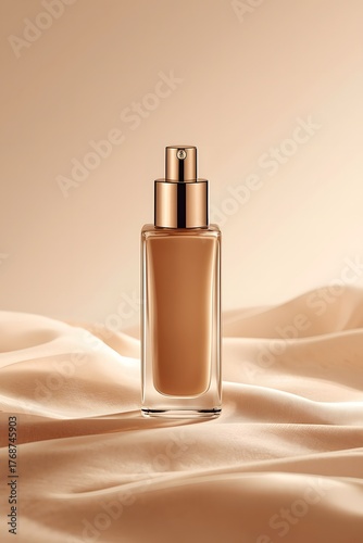 Foundation Bottle with Pump on Satin Fabric Beige Background Luxury Cosmetic Product Display for Beauty Branding and Makeup Advertising