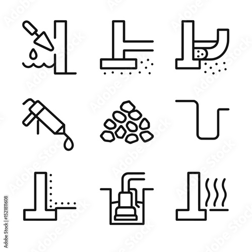 Foundation Protection Icons. Outline icon set of foundation protection: waterproofing, foundation, drainage pipe, sealant, gravel,