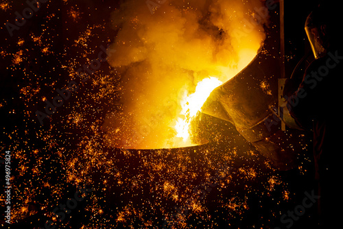 Foundry. Pouring hot metal from a ladle into molds. Bright red metal and sparks flying to the sides