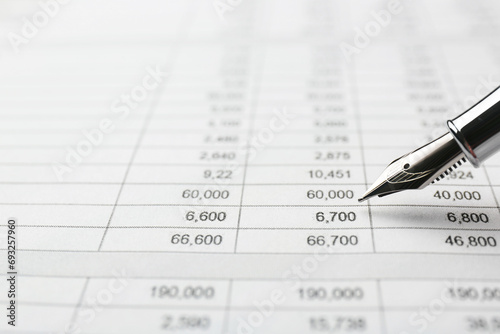 Fountain pen and accounting document with data, closeup. Space for text