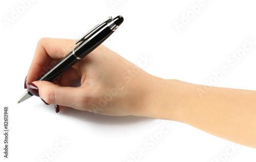 Fountain pen in female hand isolated on white