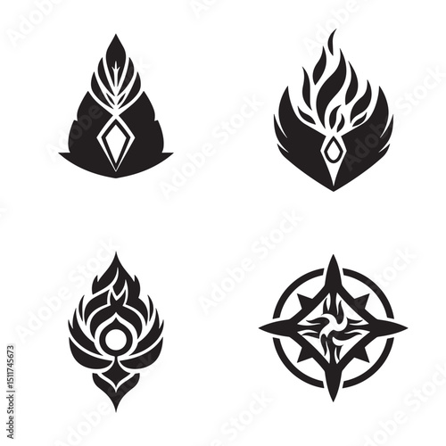 Four abstract black and white silhouette designs with geometric and nature inspired elements