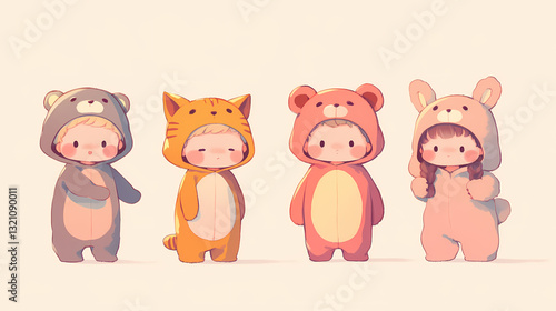 Four adorable children in animal costumes playfully posing against a soft pastel background