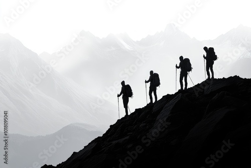 Four adventurers reaching mountain top enjoying scenic view