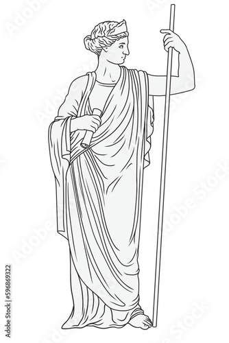 Four ancient Greek wine vases of different shapes with meander ornaments and various patterns stand in a row on a wooden shelf against a concrete wall. 3d render.
