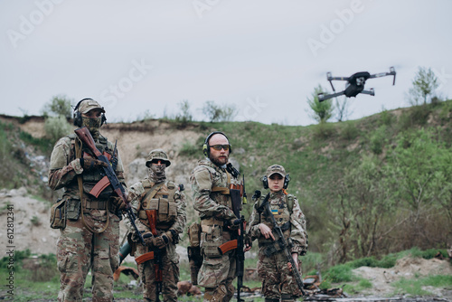 Four armed Ukrainian soldiers looking in the camera with a drone