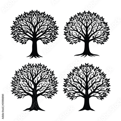 Four artistic tree designs silhouette isolated on white background