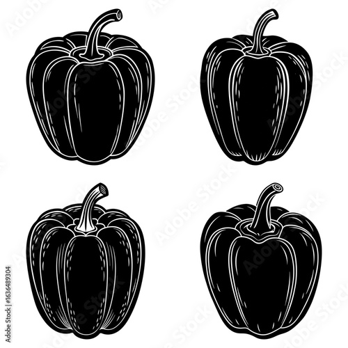 Four black and white bell peppers with detailed line work arranged in a square format on white background