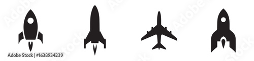 Four black and white silhouette illustrations of rockets and a jet airplane in flight mode facing upwards