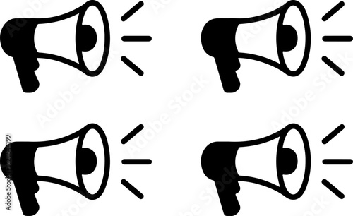 Four Black Silhouette Megaphone Icons on White Background bullhorn loudspeaker