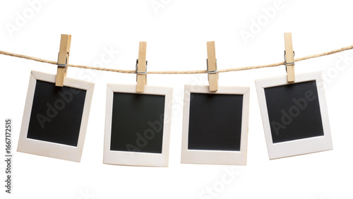 Four Blank Instant Photo Frames Hanging on Rope – Empty Picture Template PNG