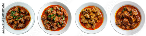 Four bowls of cubed meat in reddishbrown sauce some with herb garnish