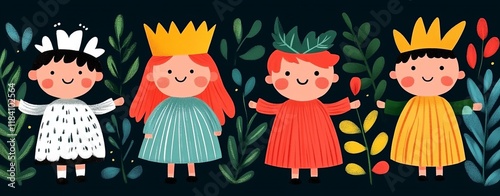 Four cheerful girls in colorful dresses and crowns stand amidst vibrant foliage, exuding a whimsical and playful atmosphere.