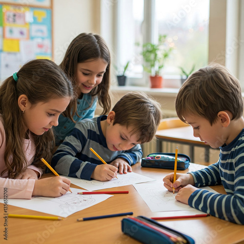 Four children sit at a table, attentively drawing with colored pencils on white paper. Scene depicts focused collaborative learning or creative activity in a classroom setting