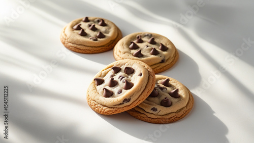 Four Chocolate Chip Cookies on White Background with Soft Natural Shadows