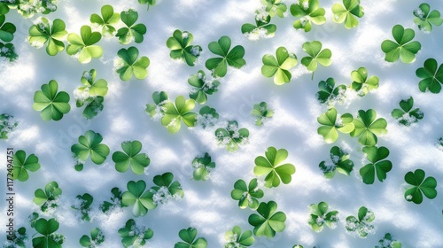 Four Clover with snow in winter season, Lucky clover leaves with four leaf,Clover flowers background,Patricks day,Spring flower pattern,St. Patrick s day seamless pattern,copy space.