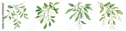 Four clusters of mistletoe branches with green leaves and white berries against a dark background.