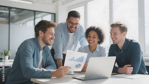 Four colleagues collaborating on a project, analyzing data on a laptop and document in a modern office setting.