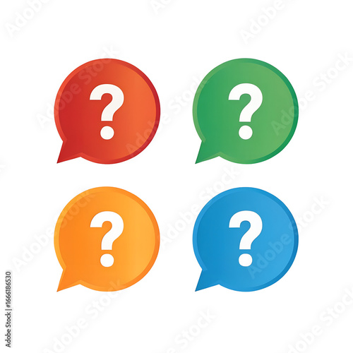 Four colorful speech bubbles with question marks isolated on transparent background