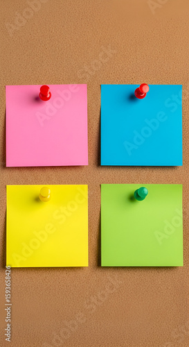 Four colorful sticky notes pinned to a brown textured surface.