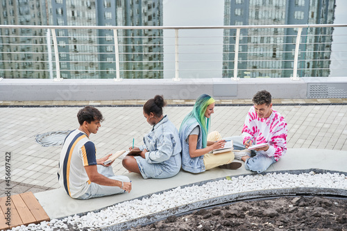 Four concentrated diverse students sitting at the street and studying at the fresh air