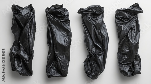 Four crumpled black garbage bags hanging on white background