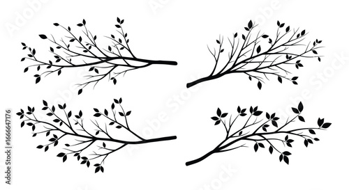 Four delicate silhouetted tree branches with small leaves perfect for spring and nature themed designs vector