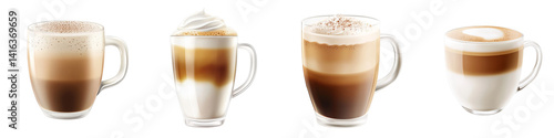 Four Delicious Coffee Drinks Latte, Mocha, Cappuccino and Iced Coffee in Glass Mugs, Isolated on Transparent Background, Coffee Variations, Beverage Illustration, Coffee, Latte, Mocha