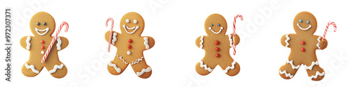 Four delightful gingerbread cookies adorned with candy canes, perfect for festive celebrations and holiday treats.