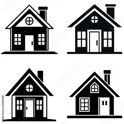 Four Different Black and White House Outline Icons with Various Details and Window Designs