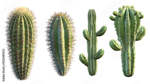 Four different types of cacti, isolated on black background.