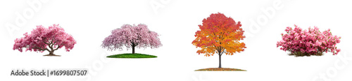 Four distinct trees with pink blossoms and autumn foliage on transparent background, cut out