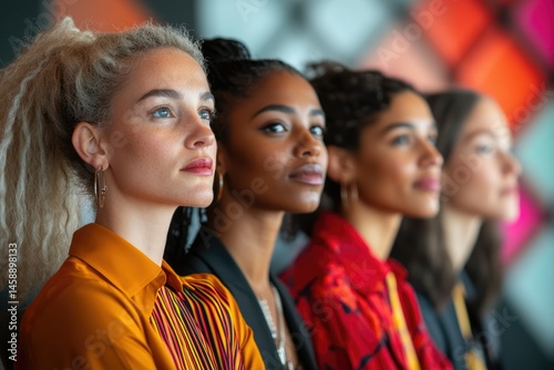 Four diverse young women stand shoulder to shoulder, exuding confidence and strength.
