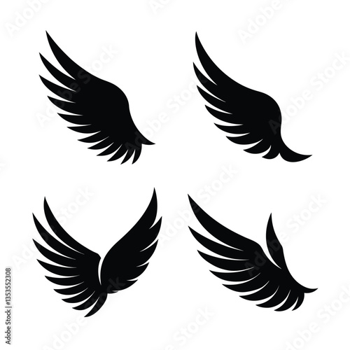 Four Elegant Black Wing Silhouettes on White Background