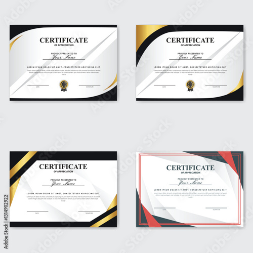 Four elegant certificates; gold, black design; white background; award templates