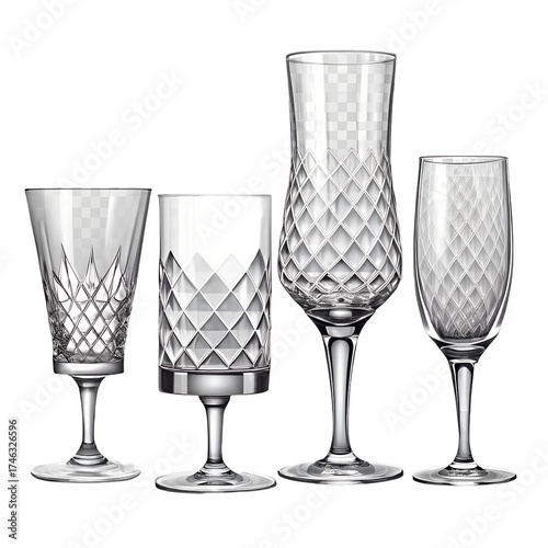 Four elegant crystal glassware items, including two champagne flutes, a wine glass, and a tumbler, each with intricate etched patterns, isolated on transparent background