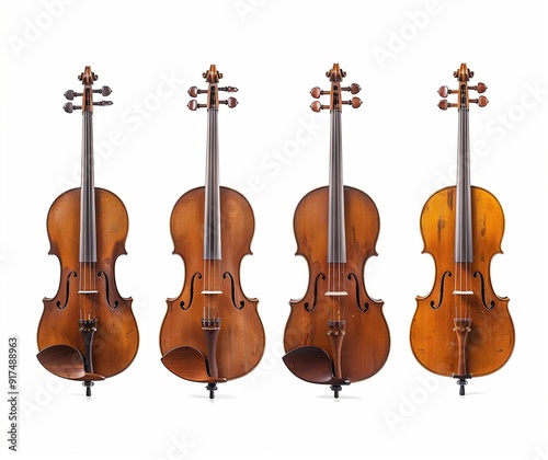 Four Elegant Wooden Violins in a Row on White Background - Musical Instruments Photo for Classical Music and Orchestra Themes