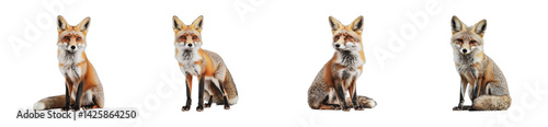 Four european red foxes sitting in a row displaying natural postures, cut out - stock png.