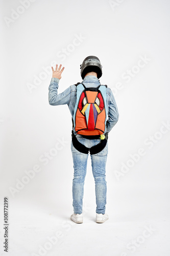 Four fingers. Fly men shows four fingers. Sky diver gestures by fingers. Teampleat skydiver.
