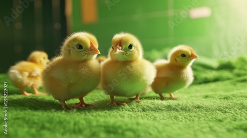 Four fluffy yellow chicks standing on a textured green surface with blurred green background